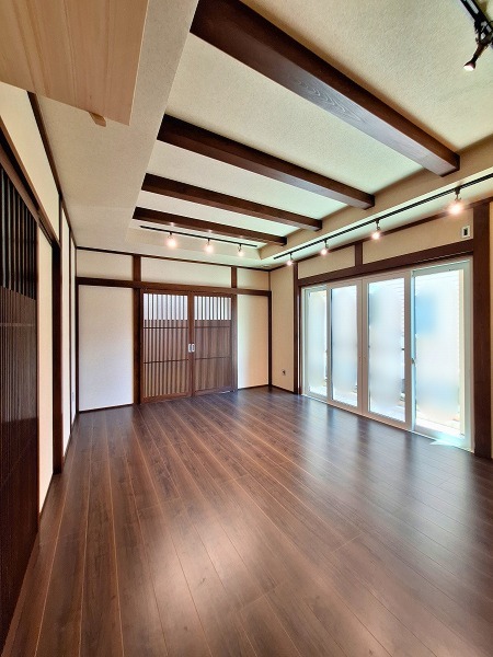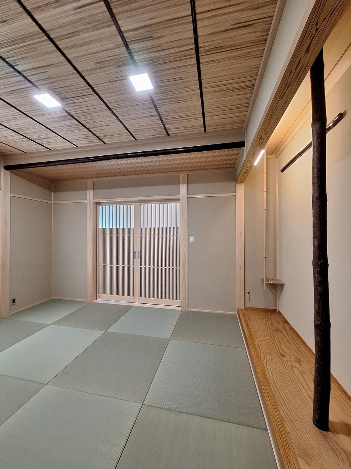畳敷きの広い和室は、客間や多目的スペースとして活用可能です。障子と竹天井が和の美しさを引き立てます。