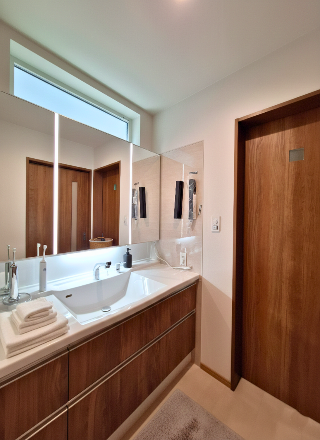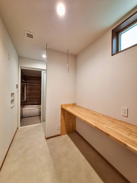 洗濯物を畳んだり、アイロンがけをしたり、多目的に使える便利な空間です。コンセント完備でドライヤーやヘアアイロン、衣類スチーマーなどを同時に使える便利な仕様になります。