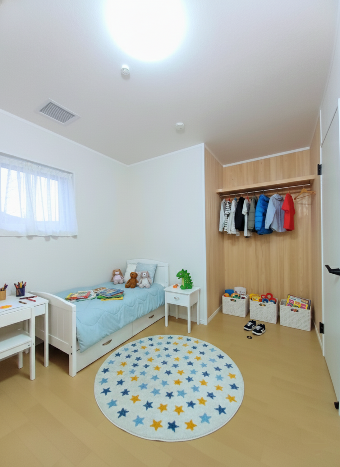 ホーム フォトギャラリー カテゴリー サブカテゴリー 無垢のぬくもりと機能美が調和する住まい ―全館空調で快適な毎日を―|中津川市 無垢のぬくもりと機能美が調和する住まい ―全館空調で快適な毎日を―|中津川市 岐阜県中津川市O様邸 カテゴリー|サブカテゴリー ネイビー×木目が映える、洗練された外観デザイン 屋根・外壁には高耐久のガルバリウム鋼板を採用し、深みのあるネイビーが印象的な外観に。ホワイトの樹脂トリプルガラスサッシがアクセントとなり、すっきりとした印象を演出します。軒裏と玄関ドアには木目調の仕上げを施し、シャープさの中にやさしさと温もりを添えた、上質な佇まいです。画像のみを表示全 22 枚中 1 枚目を表示Next ≫ 桧の温もりと実用性を兼ね備えた土間収納 自社製材の桧無垢板が美しい壁面を彩る土間収納。収納する物や動線に合わせて綿密に打合せを重ね、可動棚の配置や、あえて棚を設けないスペース、コンセントの位置まで計画的に設計。さらにハンガーパイプを設置し、傘やレインウエアーなど濡れた物も掛けられるよう工夫しました。暮らしに寄り添う使い勝手の良さが魅力です。画像のみを表示全 22 枚中 2 枚目を表示≪ Prev|Next ≫ 画像のみを表示全 22 枚中 3 枚目を表示≪ Prev|Next ≫ こだわりのキッチン 熟考し採用したのはグラフテクトのペニンシュラタイプのキッチン。グレーで引き締まる印象とし、背面収納のウォールキャビネットは暖かみのあるブラウンに。 食洗器は大容量のフロントオープンで食器類の取り出しもしやすく家事の手間を減らせます。流し元灯はレールにスポットライトを採用し、角度や位置を調整できるようにしました。画像のみを表示全 22 枚中 4 枚目を表示≪ Prev|Next ≫ 画像のみを表示全 22 枚中 5 枚目を表示≪ Prev|Next ≫ お料理を楽しむ工夫が詰まったダイニングキッチン スタイリッシュなグレーのキッチンが印象的な空間。 ホットプレートを頻繁に使用されるというお客様のご要望に応え、高気密高断熱住宅ならではの換気対策として、天井に専用の個別換気扇を設置しました。 背面には使い勝手のよいパントリーも備え、家事動線にも配慮された機能的なキッチンです。画像のみを表示全 22 枚中 6 枚目を表示≪ Prev|Next ≫ 画像のみを表示全 22 枚中 7 枚目を表示≪ Prev|Next ≫ 無垢材の風合いと機能美が調和するLDK空間 床にはナラの無垢フローリング、天井には段差を設け、高い部分に桧板をあしらいました。 木の温もりに包まれるような心地よい空間です。正面左側には収納力に優れた可動棚を設置。LD照明はレール式で、角度や位置を自在に調整できるため、シーンに合わせた照明演出が可能です。画像のみを表示全 22 枚中 8 枚目を表示≪ Prev|Next ≫ 画像のみを表示全 22 枚中 9 枚目を表示≪ Prev|Next ≫ 画像のみを表示全 22 枚中 10 枚目を表示≪ Prev|Next ≫ ニッチで気になる出っ張りもスッキリ インターホンや給湯器のリモコンの出っ張りは意外と気になるもの。 利便性を重視しキッチン近くに配置するのが一般的ですが、通路などだと邪魔だなと感じる事もあるため、ニッチを造りその中に集約しました。 下のニッチは磁石が付くクロス張りにして、プリントなどを掲示する事ができるようにしました。画像のみを表示全 22 枚中 11 枚目を表示≪ Prev|Next ≫ 温もりを感じる、シンプルで使いやすい子供部屋 収納はオープンタイプで使い勝手も抜群。内部の壁には自社製材工場で丁寧に加工した桧の無垢板を使用し、木の香りとぬくもりに包まれる心地よい空間に仕上げました。 お子様の成長と共に自由にアレンジできる、柔軟性のある一室です。画像のみを表示全 22 枚中 12 枚目を表示≪ Prev|Next ≫ 画像のみを表示全 22 枚中 13 枚目を表示≪ Prev|Next ≫ LDKに隣接したタタミスペースは、ヘリナシ畳を採用しすっきりとした印象に仕上げました。 2連引戸を閉じれば独立した空間として、開ければLDKと一体感のある広々とした空間として利用でき、暮らしに合わせた柔軟な使い方が可能です。 和の趣を感じさせる照明が空間に温かみと落ち着きを添えています。画像のみを表示全 22 枚中 14 枚目を表示≪ Prev|Next ≫ 画像のみを表示全 22 枚中 15 枚目を表示≪ Prev|Next ≫ 大収容のファミリークローゼット 両壁面に枕棚とハンガーパイプを設け、収納力の高いファミリークローゼットとしました。 正面には24時間換気システムを設置。 フィルターの清掃などメンテナンス性を考慮し、お施主様の利便性に配慮しました。画像のみを表示全 22 枚中 16 枚目を表示≪ Prev|Next ≫ 画像のみを表示全 22 枚中 17 枚目を表示≪ Prev|Next ≫ お子さまの成長に合わせて柔軟に使える設計 広々とした子供部屋は、将来2部屋に分けられるようあらかじめ設計されています。 成長に合わせた使い方ができる、家族思いの間取りです。画像のみを表示全 22 枚中 18 枚目を表示≪ Prev|Next ≫ 木の温もりを感じる、階段下を活かした洗面スペース 廊下に設けた洗面台は、階